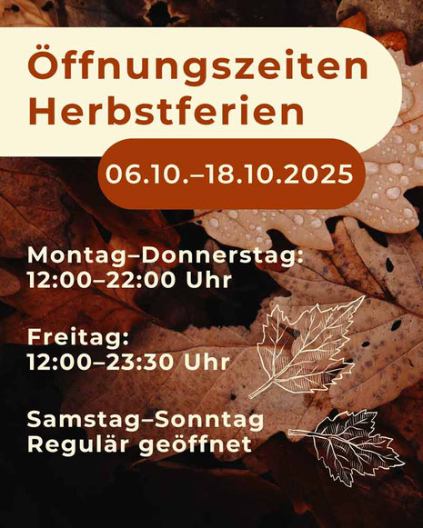 Bitte achtet darauf, dass wir in den Herbstferien andere Öffnungszeiten haben. Diese sind: